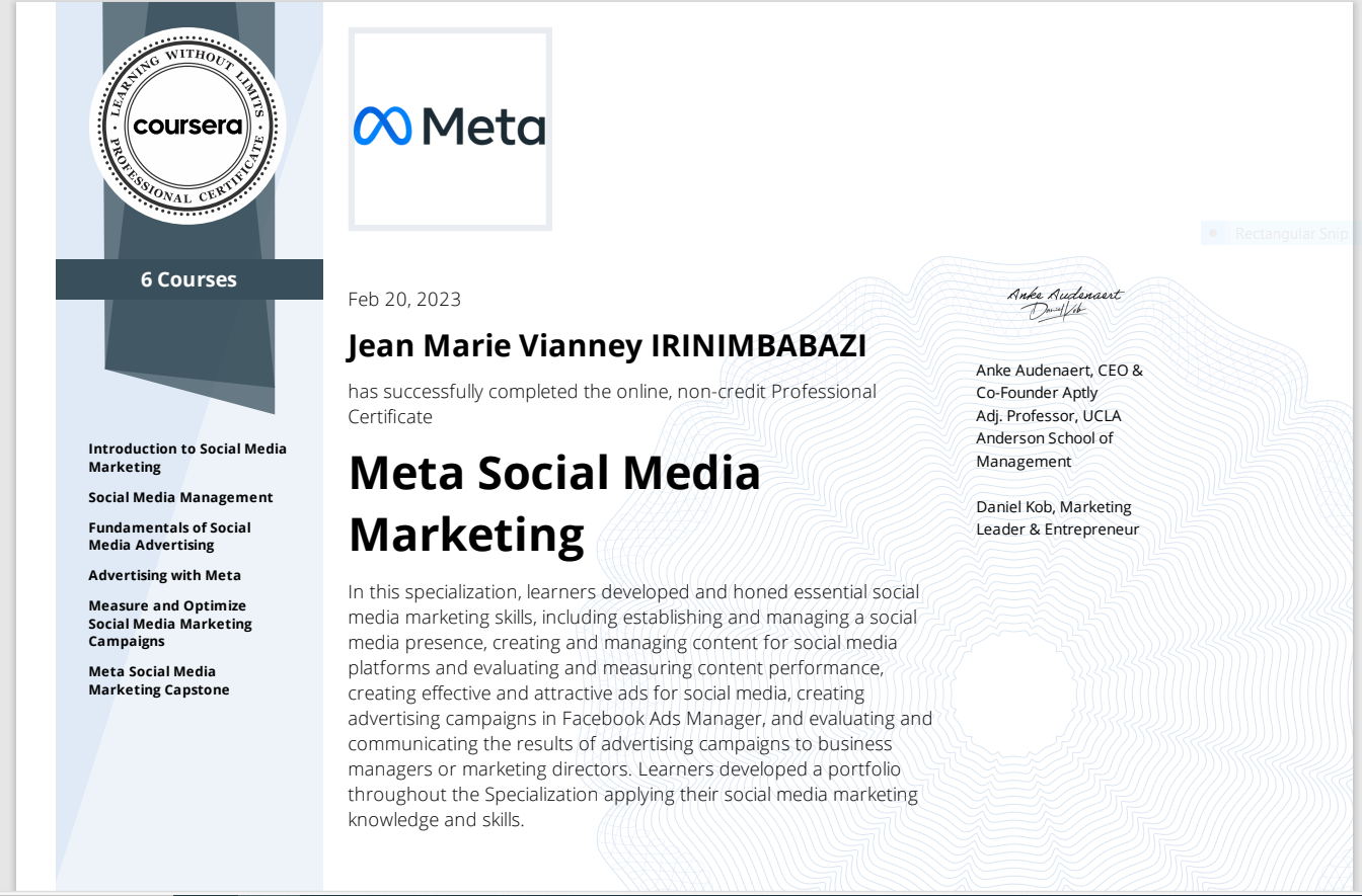 My educational journey demonstrates a solid foundation in software engineering from the University of Lays Adventists of Kigali, complemented by specialized training in web application development from the University of Michigan. The icing on the cake is the prestigious certification in digital marketing from Meta Incorporation, marked by the achievement of a Blue Badge as a Meta Certified Digital Marketing Associate. This well-rounded education equips me with a comprehensive skill set to excel in the dynamic fields of software engineering and digital marketing.